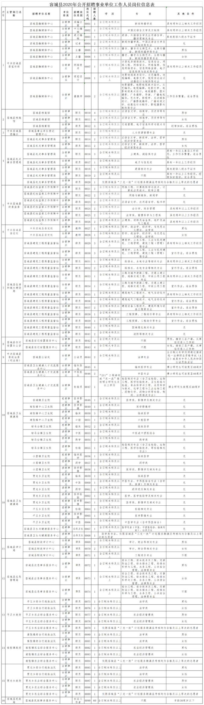 >容城县人力资源和社会保障局2020年公开招聘事业单位工作人员194人