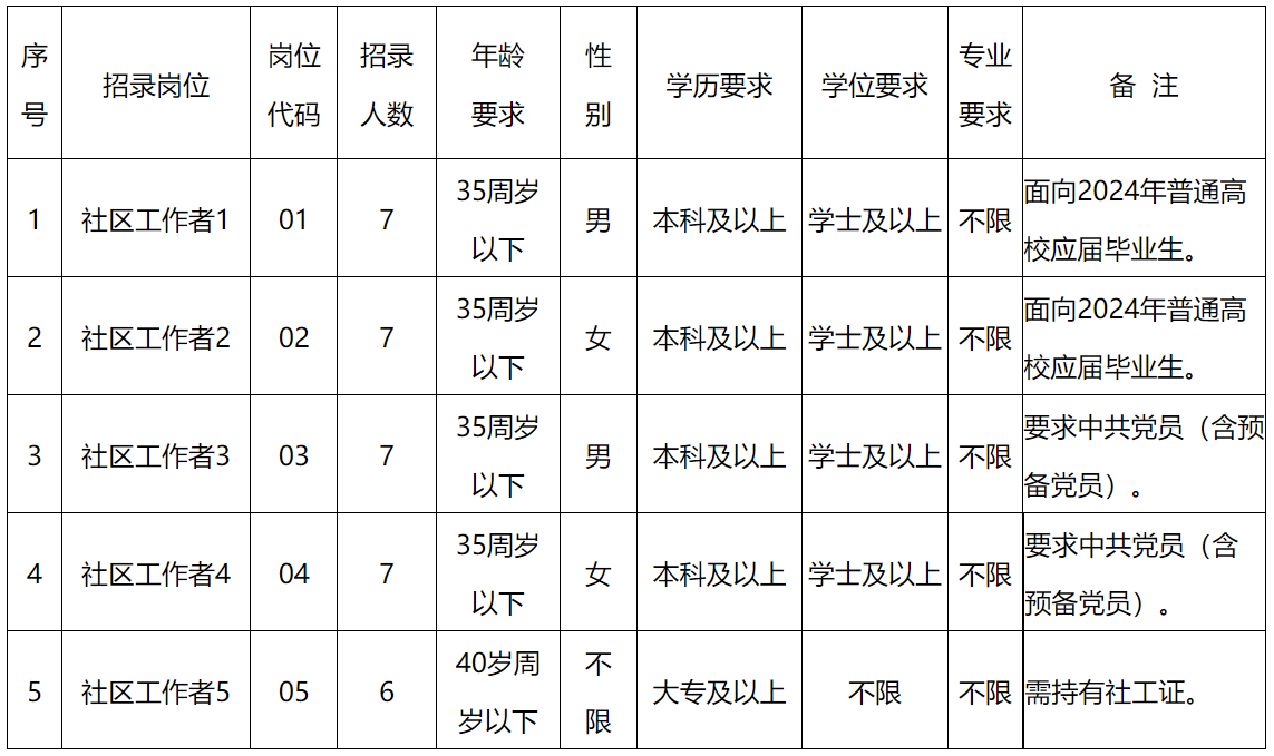 本次面向社会公开招录专职社区工作者共34名,具体岗位如下: