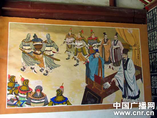 入山门内,只见山门侧两幅壁画栩栩如生,一幅“三顾茅庐”,描述刘备为求东山再起,冒风雪严寒第二次到隆中请诸葛亮出山,图中刘、关、张落马扣门,童子相迎;另一幅“将星陨落”,描述诸葛亮病逝五丈原军中,临终之前给姜维、杨仪叮嘱后事的场景。