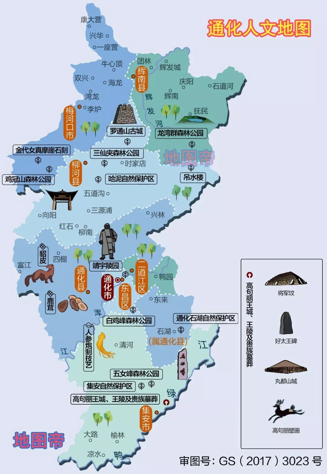 通化市位于吉林省南部,西接辽宁省,东南以鸭绿江与朝鲜半岛为界,地势北低南高。通化之所以叫通化,是因为这里本称为通沟,后归王化,合称通化。通化东南有个县级市,就是大名鼎鼎的古城集安,高句丽曾在集安定都425年,称为国内城。1965年改名集安,取“社会安定”之意。