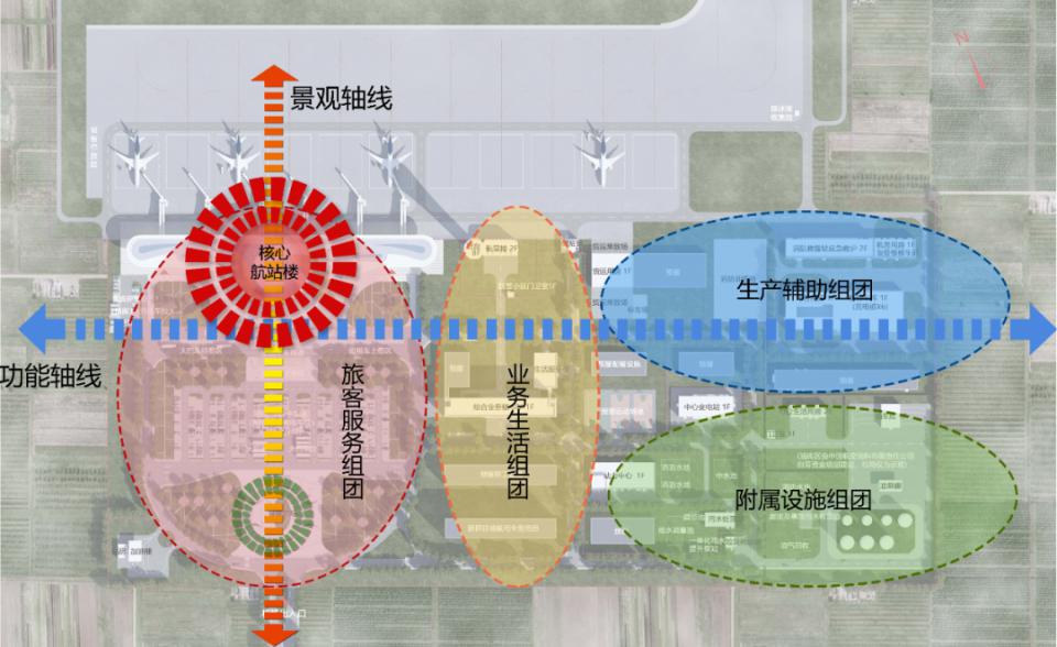 航站区整体规划融入了当地环境资源优势与深厚的地域文脉——巧妙地将原场地的绿化生态特征重塑,生态绿轴衔接航站楼、陆侧与空侧空间,将飞行区、旅客航站区、货运区、工作区、油库区等区域串联成独特的空间序列,形成 " 一核、两轴、四组团 " 的规划格局。统筹考虑近远期规划,重点解决涉及机场发展的现实问题,兼顾一定的前瞻性和灵活性,打造枢纽、城市、产业深度融合示范样本,展示璀璨的秦地文化。