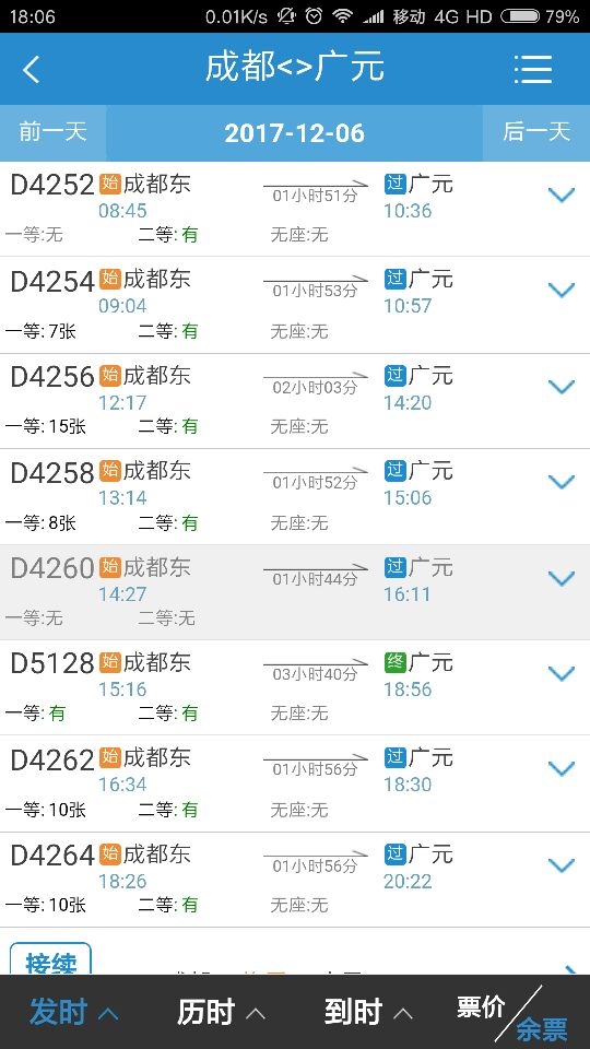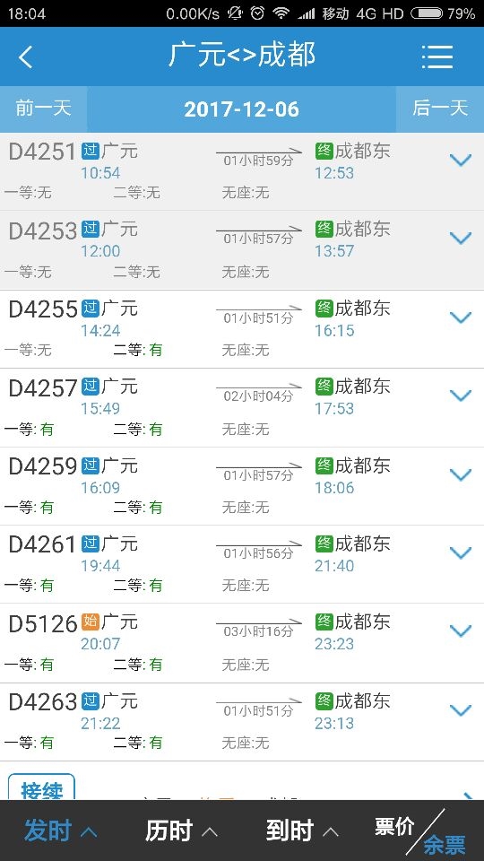 12306手机客户端显示,从12月6日开始广元到成都的来回动车增加到8列。最早的一列时间为早上10点54分,最晚的一列时间为21点22分,中间平均间隔1小时一趟。相比于原有的D5126次列车晚上23点23分到达成都来说,新开7列动车的提供了更多选择。