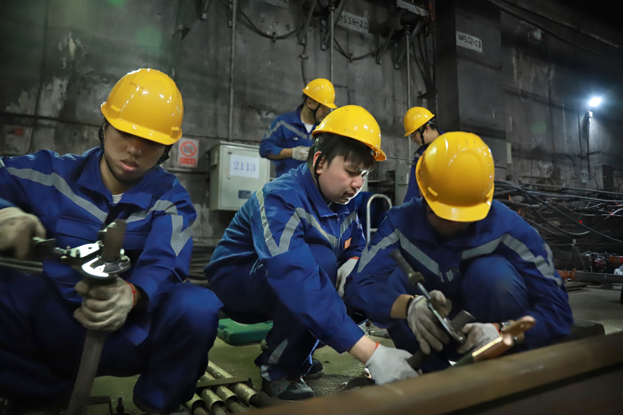 深夜的地铁站依旧灯火通明。上海地铁维保供电分公司技术员高远在闷热昏暗的隧道中拼装回流电缆。在他身旁,工务人员正抓紧拆除替换一段变形的钢轨。