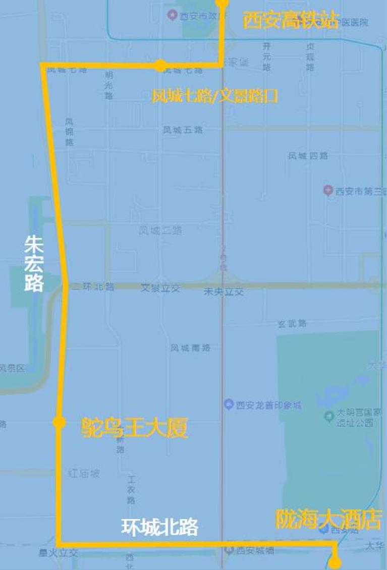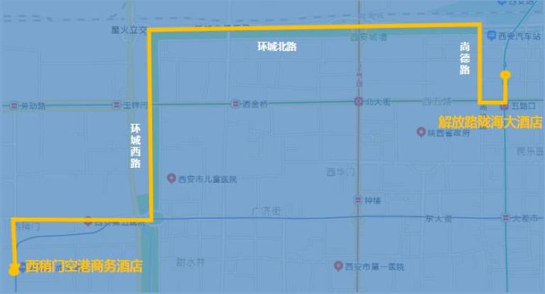 机场—西安高铁站(文景路口)—凤城七路/文景路口—鸵鸟王大厦—火车站陇海大酒店—西稍门空港商务酒店(21:00-23:30)