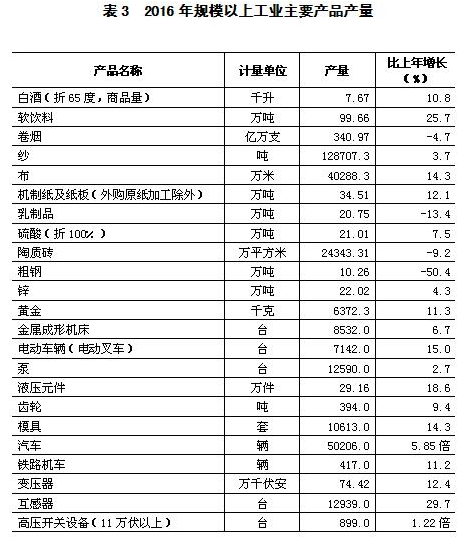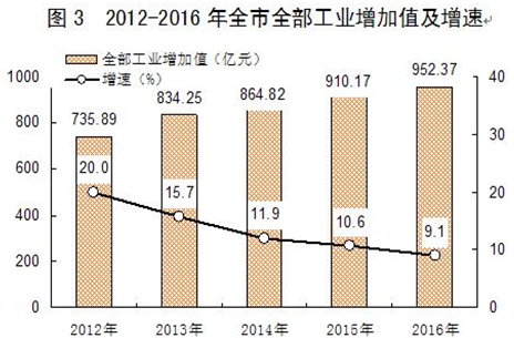 全年全部工业增加值952.37亿元,比上年增长9.1%,其中规模以上工业增加值914.05亿元,增长9.4%。