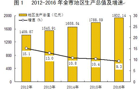 初步核算,全年实现地区生产总值1932.14亿元,比上年增长9.3%。其中,第一产业增加值171.46亿元,增长3.7%;第二产业增加值1227.06亿元,增长10.1%;第三产业增加值533.62亿元,增长9.1%。三次产业结构比为8.9:63.5:27.6,第三产业增加值占地区生产总值的比重较上年提高1.2个百分点。按常住人口计算,全市人均生产总值51262元,折合7390美元(汇率为1美元兑6.9370元人民币)。非公有制经济增加值974.52亿元,占全市经济总量的比重为50.4%。