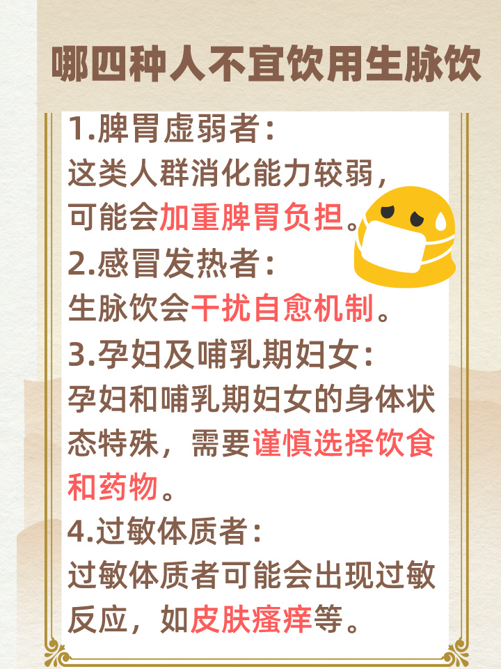 1.脾胃虚弱者:这类人群消化能力较弱,而生脉饮中的药材可能会加重脾胃负担,导致消化不良、腹胀等症状。
