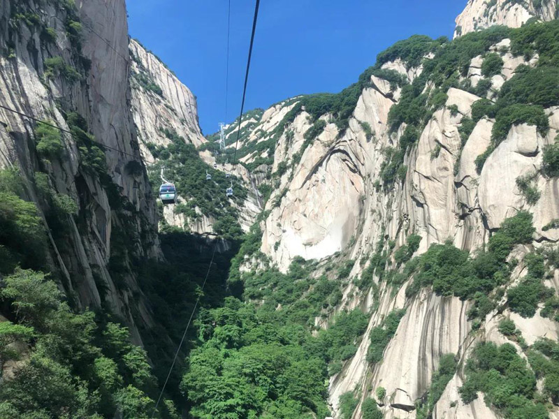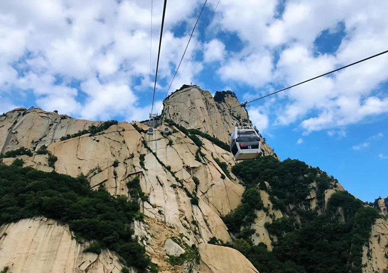 太华索道:华山西线索道是迄今为止世界上第一条采取崖壁开凿硐室站房、起伏式走向、设中间站的单线循环脱挂式索道,索道设备自法国引进,采取全程数字自动化控制系统,达世界一流水平。索道下站设在瓮峪内东沟口,中间站设在仙峪白雀寺,上站设在华山西峰巨灵足南侧下绝壁洞室内。索道线路斜长4211米,相对高差894米,支架28个,客运吊厢84个,吊厢间距为115米,每厢可乘8人,运行速度最快6米/秒,单向运量1500人/小时。