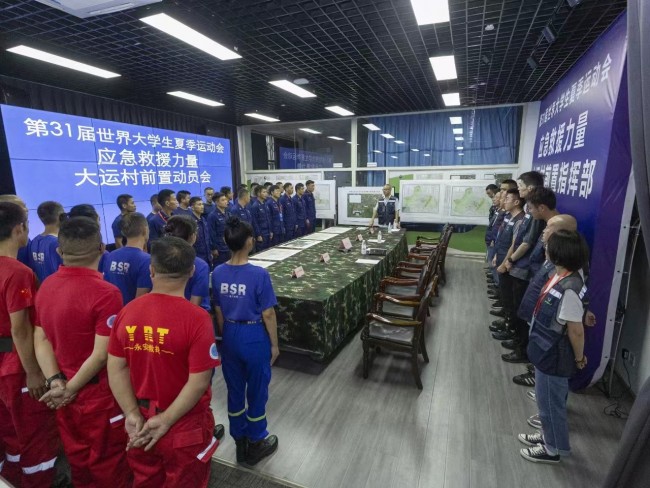 (第31届世界大学生夏季运动会应急救援力量大运村前置备勤保障。成都市应急局供图)