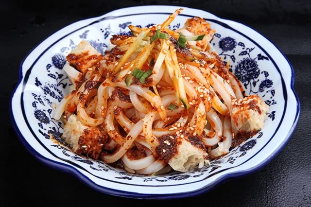 擀面皮是陕西关中地区特有的一种传统名小吃,尤以西府宝鸡地区为最佳,是从唐代冷淘面演变而来,因其劲道、凉爽、鲜香、酸辣可口,成为陕西最具代表性的小吃之一。岐山擀面皮于2011年被认定为中华名小吃,是宝鸡著名的特色小吃。擀面皮选料精良,工艺严谨,调味讲究,而岐山人的擀面皮做法很非凡,别处的米面皮和酿皮是把面调成糊状,放在特制的铁笼上蒸。歧山擀面皮则是先擀成面,然后再蒸,蒸熟后再切成比凉皮稍宽的条状,吃法和米面皮基本一样,不同于米面皮的是,擀面皮口感较硬,韧度高,有筋性。岐山擀面皮被中国烹饪协会评选为...陕西省的“中国地域十大名小吃”。 【 详细>>】