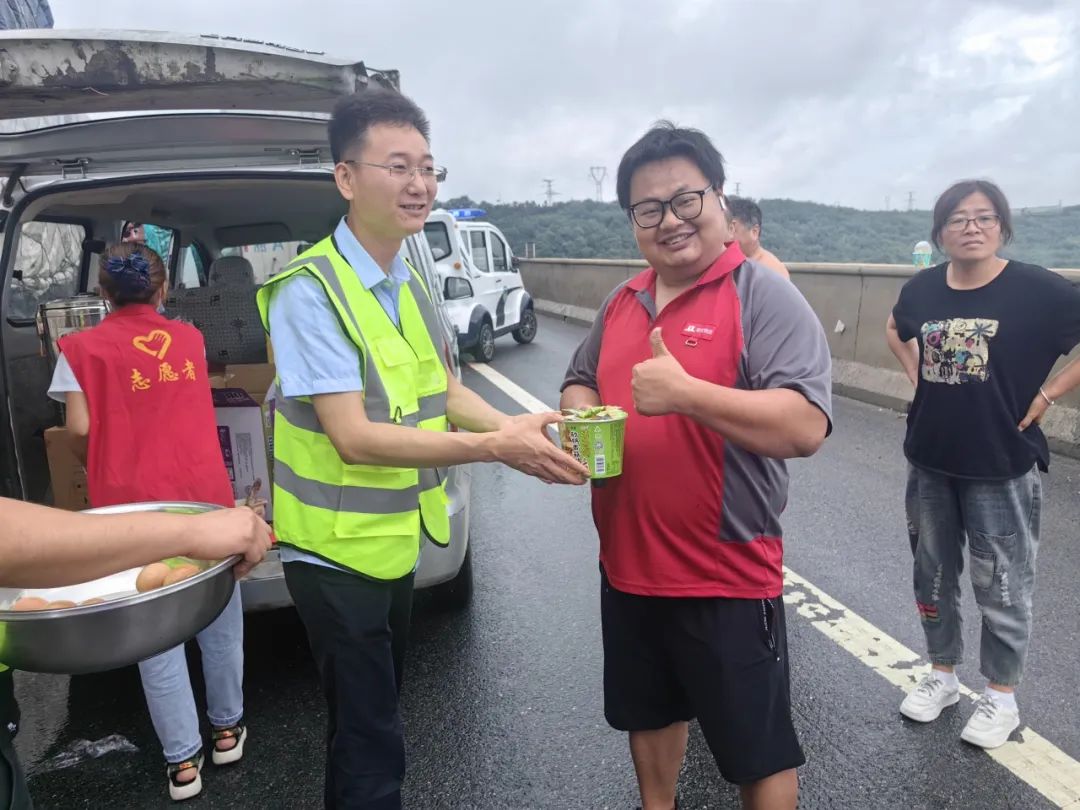 由于滑坡情况较为严重,道路抢修工作预计需要较长时间,致使本路段滞留车辆等待时间不断延长。在接7月17日早交控集团黄会奇总经理在防汛会议的精神传达后,宝鸡南服务区第一时间,紧急行动为服务区附近的清水河大桥滞留司乘人员送去免费的泡面、鸡蛋、菜夹馍、稀饭等食品,缓解滞留司乘的焦虑和解决他们的饮食问题。