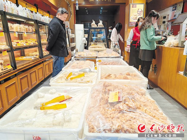 趣味香成立于上世纪80年代,专注于制作各类长沙传统糕点,1982年搬迁至东塘,41年原址原店,延续至今。走进店里,各种新鲜出炉的糕点琳琅满目,老少皆宜。比如,灯芯糕色泽洁白,形似灯芯,点火即可燃烧,吃上一口,让人心旷神怡。焦切黑白分明,焦糖与炒熟的芝麻融为一体,趁热压制成型、切片,拿一片焦切放在舌尖上,甜香柔绵悠长。坚持古法手作、现做现卖,是几十年不变的老长沙味道。