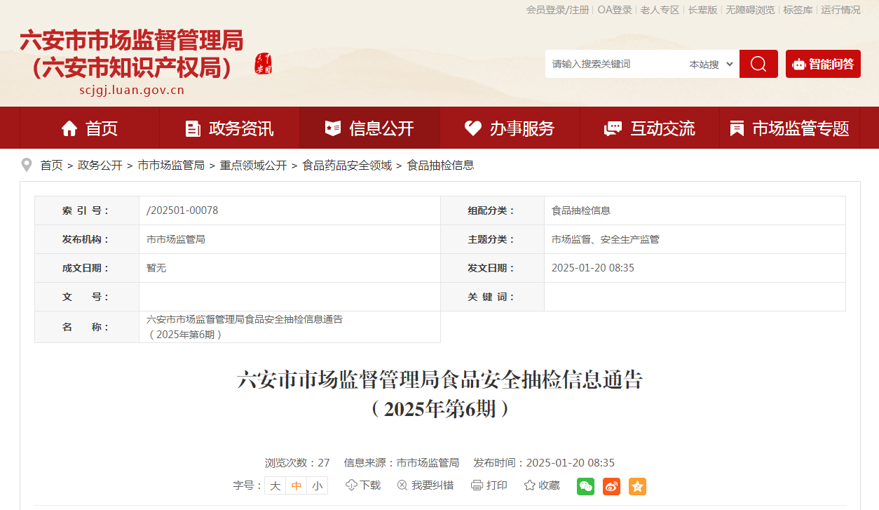 六安市市场监督管理局食品安全抽检信息通告(2025年第6期)