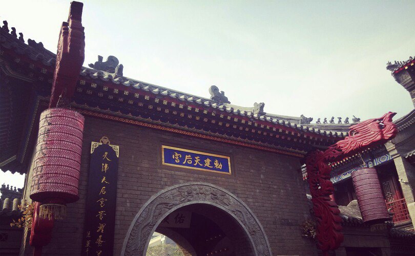 天津天后宫是国家AAA级景区、天津市文物保护单位,是集妈祖文化、天津地域民俗文化、民间信仰研究及展览、游览功能于一体的综合性民俗博物馆。元至元十五年至二十年间(1278-1283年)初建,元泰定三年(1326年)由元政府正式下诏敕建,1985年大规模重建,同时成立天津市民俗博物馆。 天津天后宫坐西朝东,占地5360平方米,从东至西由戏楼、幡杆、山门、牌坊、前殿、正殿、凤尾殿、藏经阁、财神殿、关帝殿、启圣祠以及钟楼、张仙阁和四座配殿组成。1985年重建之后,除保留天后宫复原陈列展览为,还陆续开辟了以展示天津民俗民风为基础内容的陈列展览,比较系统地介绍了漕运、婚育、商业、民间生活、民间艺术及民间信仰等习俗内容。近年来与台湾北港朝天宫、大甲镇谰宫、香港天后宫、澳门妈祖庙、福建湄洲莆田妈祖庙、上海天后宫、青岛天后宫、长岛显应宫保持着长期友好合作的关系。景区内每年春节期间举办传统文化庙会;农历三月二十三都要举办妈祖诞辰民间祭典;曾成功举办过五届中国?天津妈祖文化旅游节, 2009年天后宫与天津民俗文化馆(建筑面积达三千余平方米)强强联合。并推出民间绝活十八坊项目。