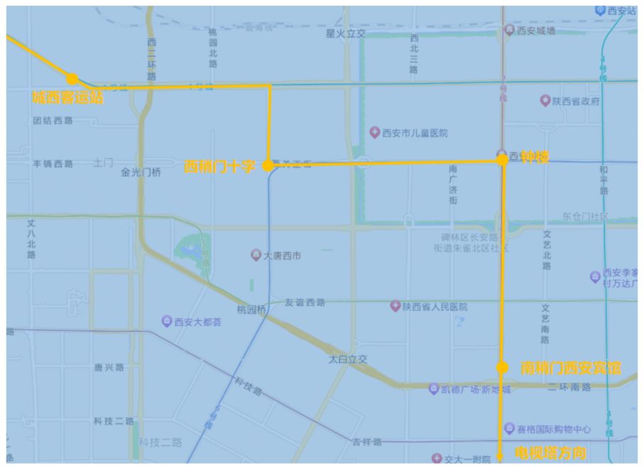 ※城西客运站:西安市莲湖区西郊枣园西路;西稍门十字:西安市莲湖区劳动南路与西关正街路口;钟楼:西安市碑林区南大街110号;南稍门西安宾馆:西安市长安北路26号;电视塔:西安市雁塔区雁展路电视塔