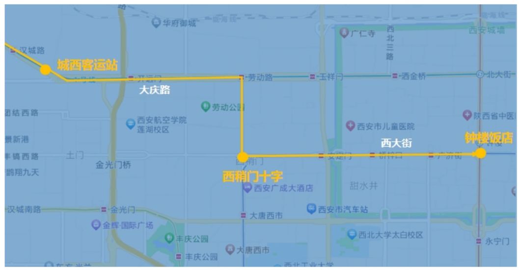 ※城西客运站:西安市莲湖区西郊枣园西路;西稍门十字:西安市莲湖区开元商城公交站;钟楼饭店:西安市碑林区南大街110号
