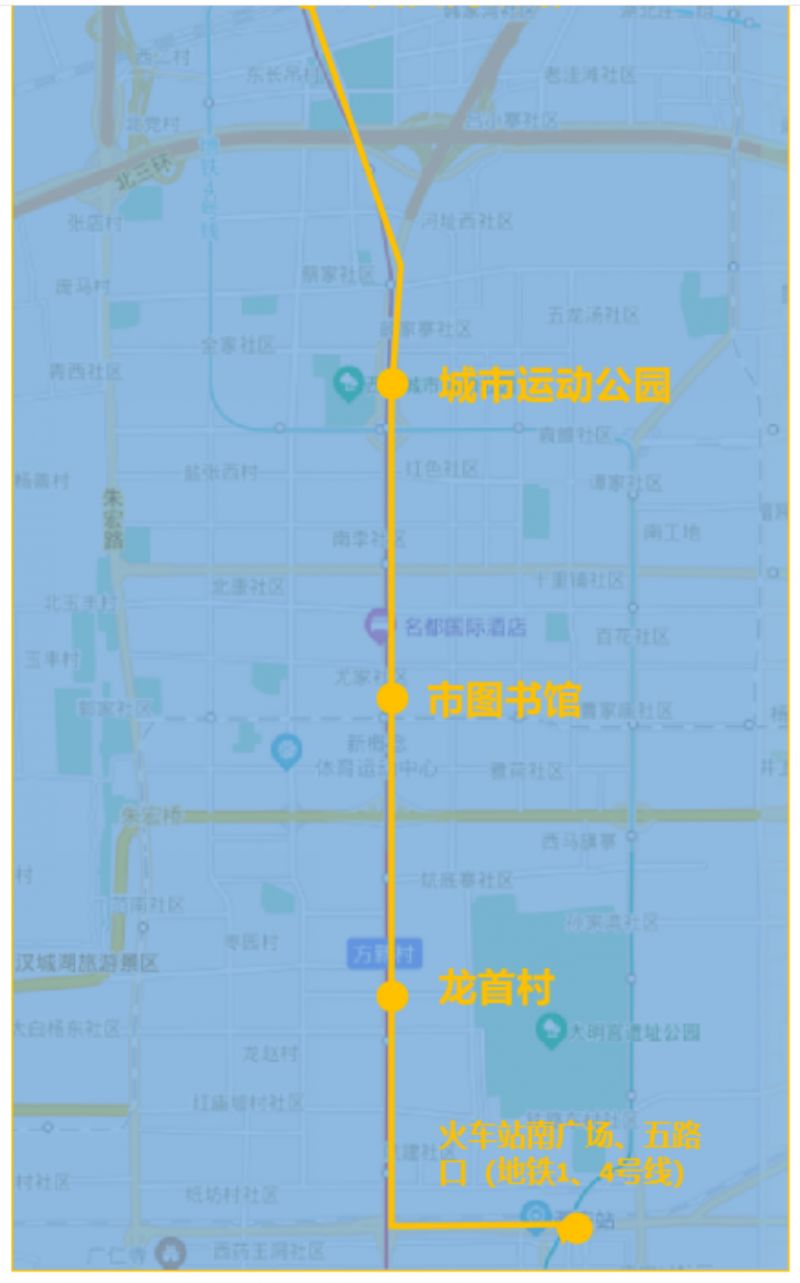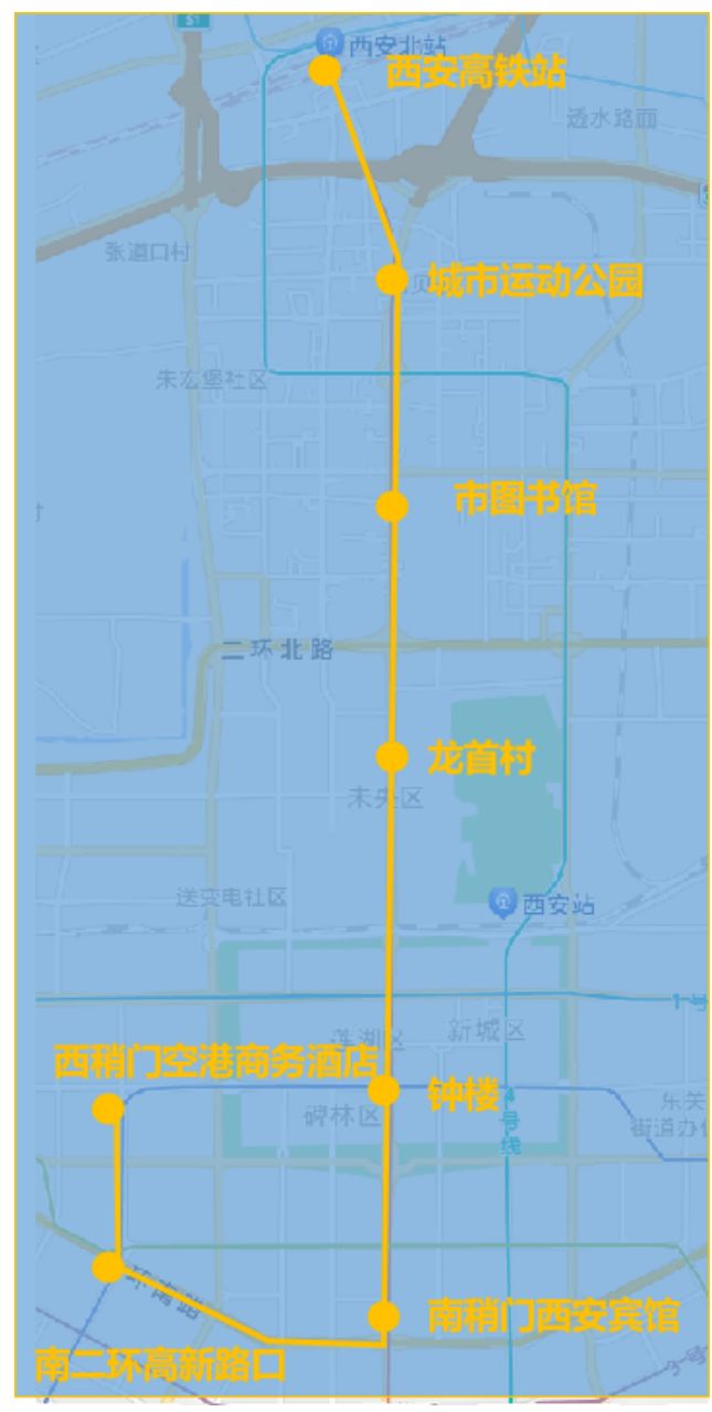 (4)运行线路:机场—西安高铁站(文景路口)—城市运动公园—市图书馆—龙首村—火车站南广场—五路口(地铁1、4号线)