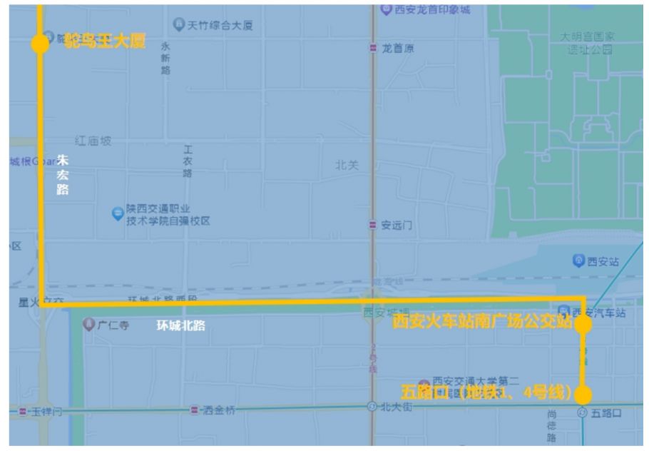 ※西安高铁站:西安市未央区元朔路;城市运动公园:陕西省西安市未央区未央路(地铁二号线城市运动公园站);市图书馆:西安市未央区未央路岗家寨;龙首村:陕西省西安市莲湖区未央路;火车站南广场:西安市新城区环城北路44号西安站;五路口(地铁1、4号线):西安市新城区解放路306号
