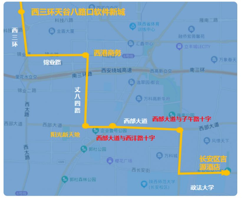 (3)运行路线:机场—软件新城(西三环与天谷八路十字)—西港商务中心(丈八四路与锦业路十字)—阳光新天地(西部大道与博士路十字)—西部大道与西沣路十字—西部大道与子午大道十字—长安区吉源酒店