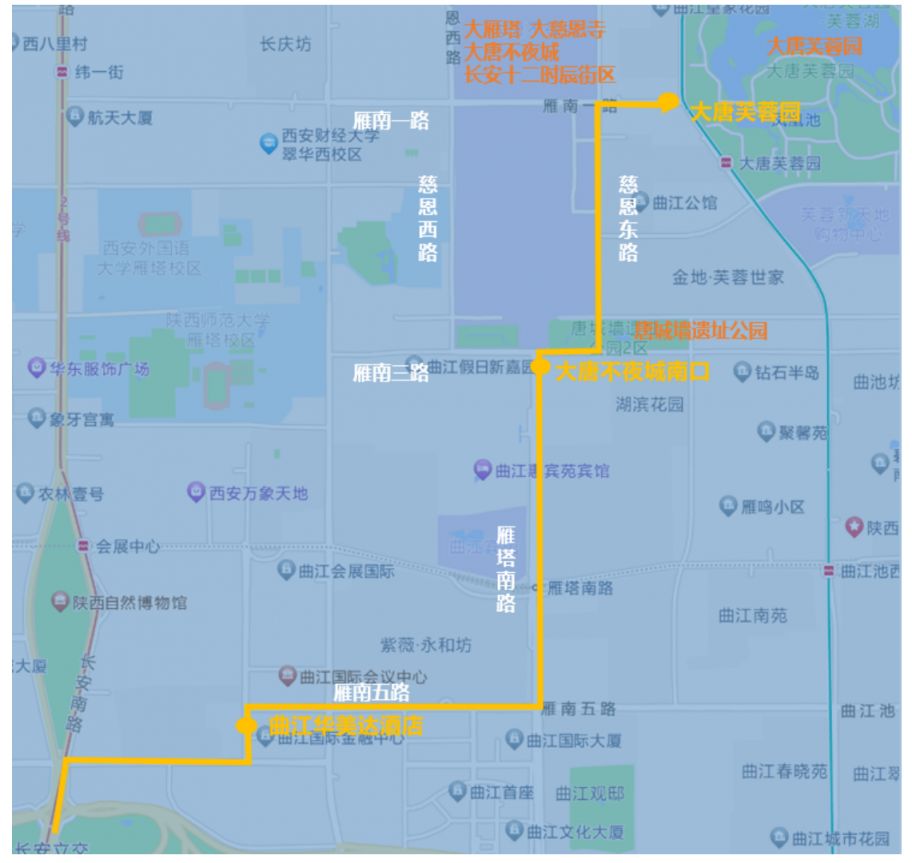 ※曲江华美达酒店:西安市雁塔区雁南五路1958号;大唐芙蓉园:西安市雁塔区芙蓉西路99号