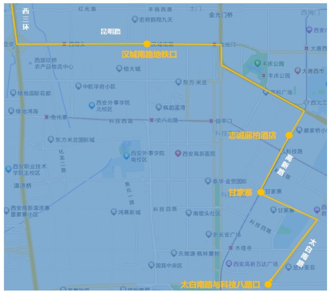 ※西窑头站:昆明路与阿房路交汇处西;外事学院北校区:科技西路1301号;丈八北路站:科技西路与丈八北路交汇处东;志诚丽柏酒店:西安市雁塔区高新路46号