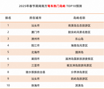 而对于喜欢海滨风光的游客来说,南方的岛屿同样不容错过。预计春节期间,南方汕头市南澳岛生态旅游区以其美丽的海滩和丰富的生态资源而受到青睐排名热门自驾岛屿第一,厦门市鼓浪屿风景名胜区、漳州市东山岛、阳江市海陵岛风景区等岛屿驾车热度均较高。