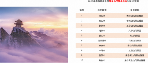 在登山胜地方面,洛阳市的老君山风景名胜区以其壮丽的自然风光和深厚的文化底蕴,预计将成为全国驾车热度最高的登山目的地。紧随其后的是舟山市的普陀山风景名胜区、忻州市的五台山风景名胜区以及池州市的九华山风景区,这些地方以其独特的宗教文化和自然景观吸引着众多游客。