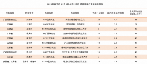 春节后(2月5日至2月22日),预计全国高速易拥堵路段主要为G65包茂高速贺州段(水冲口隧道到同古立交),全天拥堵延时指数约为4.4,全天平均车速约23公里/小时。其次是G60沪昆高速上饶段、G5011芜合高速芜湖段等。