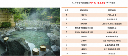 在南方,温泉景区成为冬日的理想避寒胜地。石阡古温泉以其历史悠久和天然水质备受欢迎,位居南方驾车热门温泉景区之首。古兜温泉小镇以其舒适的设施和优美环境位列第二。而防城港市的上思县十万大山布透温泉则以其清澈泉水和宁静氛围排名第三,是放松身心的不二之选。