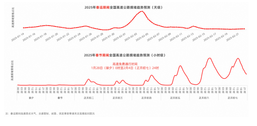 受春节假期提前出行影响,预计全国高速出程高峰为2025年1月18日(腊月十九)、 1月19日(腊月二十)、以及1月25日(腊月廿六),公众出行较为分散。而随着公众错峰意识日益加强,预计返程高峰将出现在2月3日(正月初六)、2月4日(正月初七)的14时至19时。此外,受走亲访友传统的影响,预计1月30日(正月初二)11时至12时全国高速会有一个拥堵小高峰。