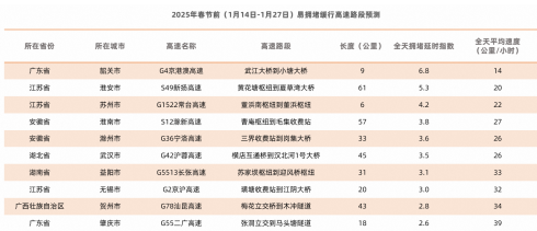 春节期间(1月28日至2月4日),预计全国高速易拥堵缓行路段主要为 G65包茂高速贺州段(水冲口隧道到同古立交),全天拥堵延时指数约为6.9,全天平均车速约15公里/小时。其次是G2京沪高速泰州段、G5513长张高速益阳段等。