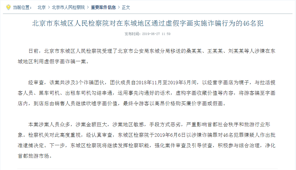 北京市东城区人民检察院6月27日在人民检察院案件信息公开网发布消息称,日前,该院受理了北京市公安局东城分局移送的桑某某、王某某、刘某某等人涉嫌在东城地区利用虚假字画诈骗一案。