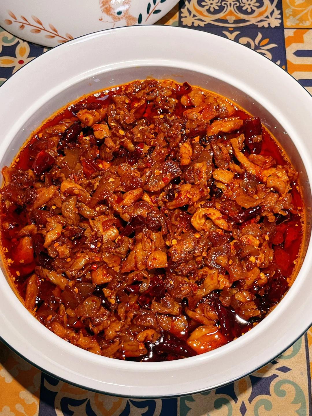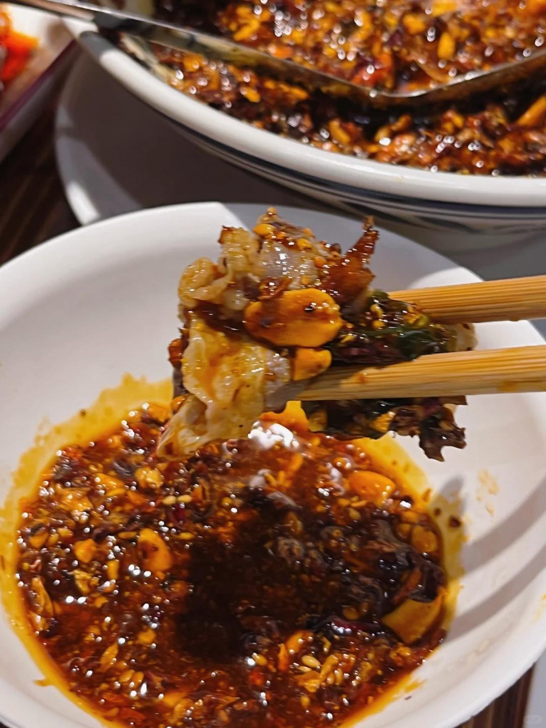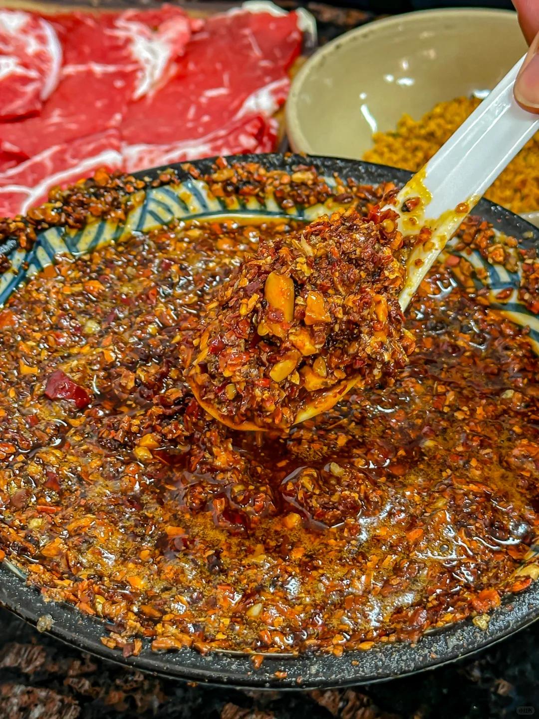再调一点辣子油碗。肉片烫好,在辣子里翻滚片刻,穿上一层红通通、油亮亮的火热外套,一入口香麻了。