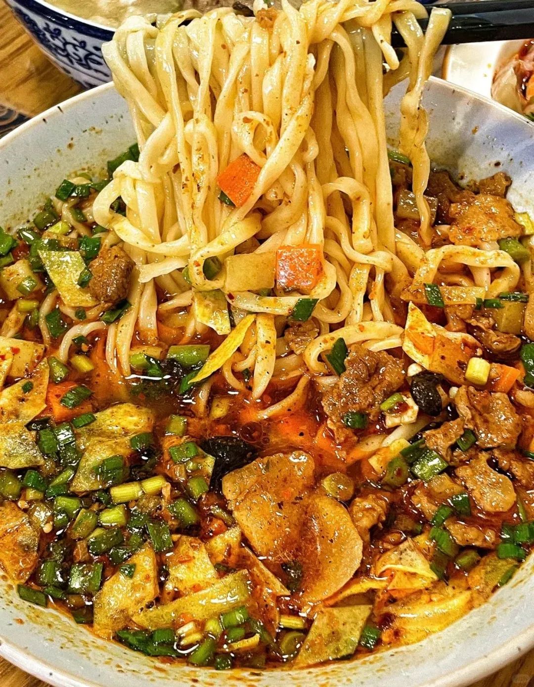 一碗面汤多面少,油光红润,一筷头捞出来,挂着红油和各种臊子,吸溜吸溜,很是扎实,满嘴香味。