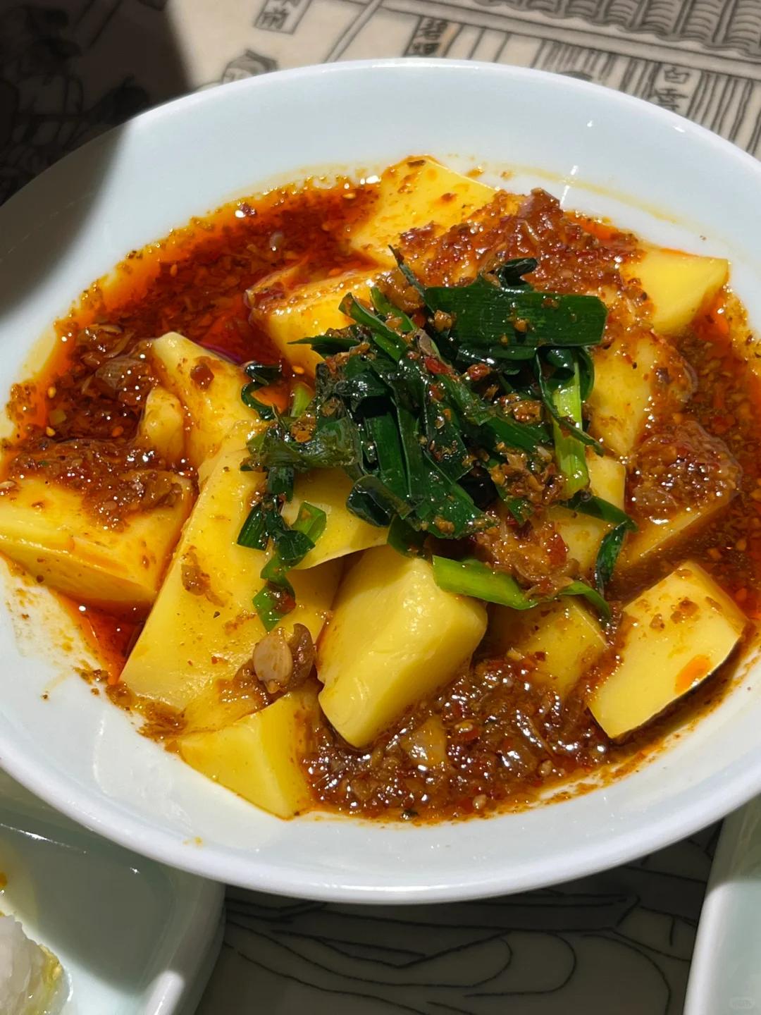 滑而鲜嫩的豆花,配上酸酸辣辣的臊子,当软嘟嘟的豆花和红艳艳的臊子进入嘴里时,豆香和肉味在口腔里交缠。