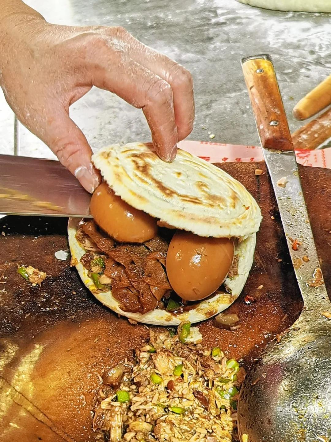 但正是这种平淡的踏实,更能体现出馍内臊子的美味。用炭火烤制的馍夹上热臊子,猪肉和汤汁瞬间浸到面皮里面。