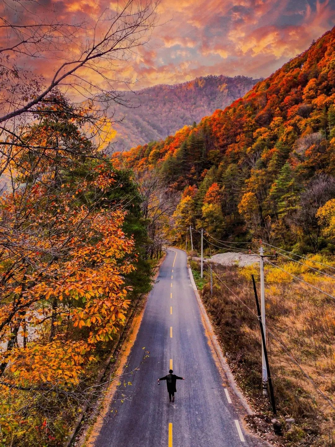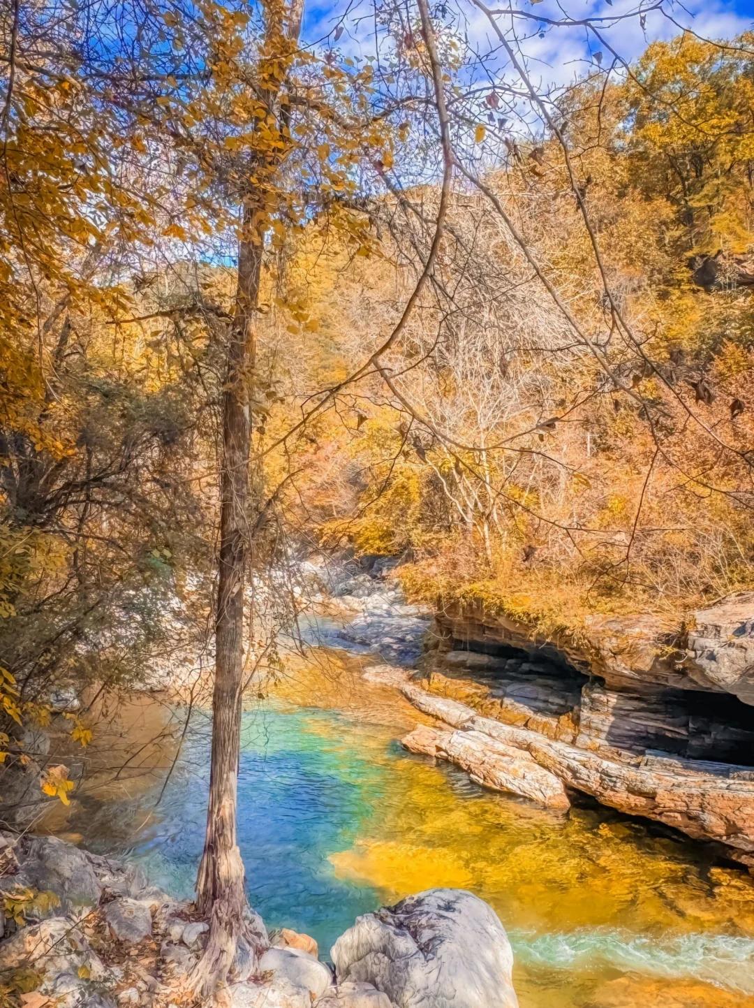 尤其是在秋天,枫叶带着火红的颜料,画满了整座山川河流。你可以看这儿的水,这儿的树,就如同在看一幅油画一般。