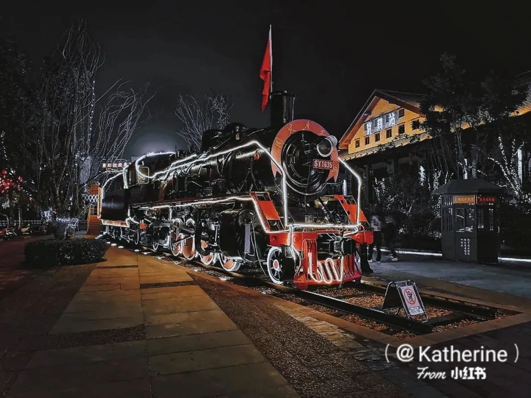 走在老街上,一座老火车头,一台老式蒸汽机头,还有移动陈旧的候车厅。