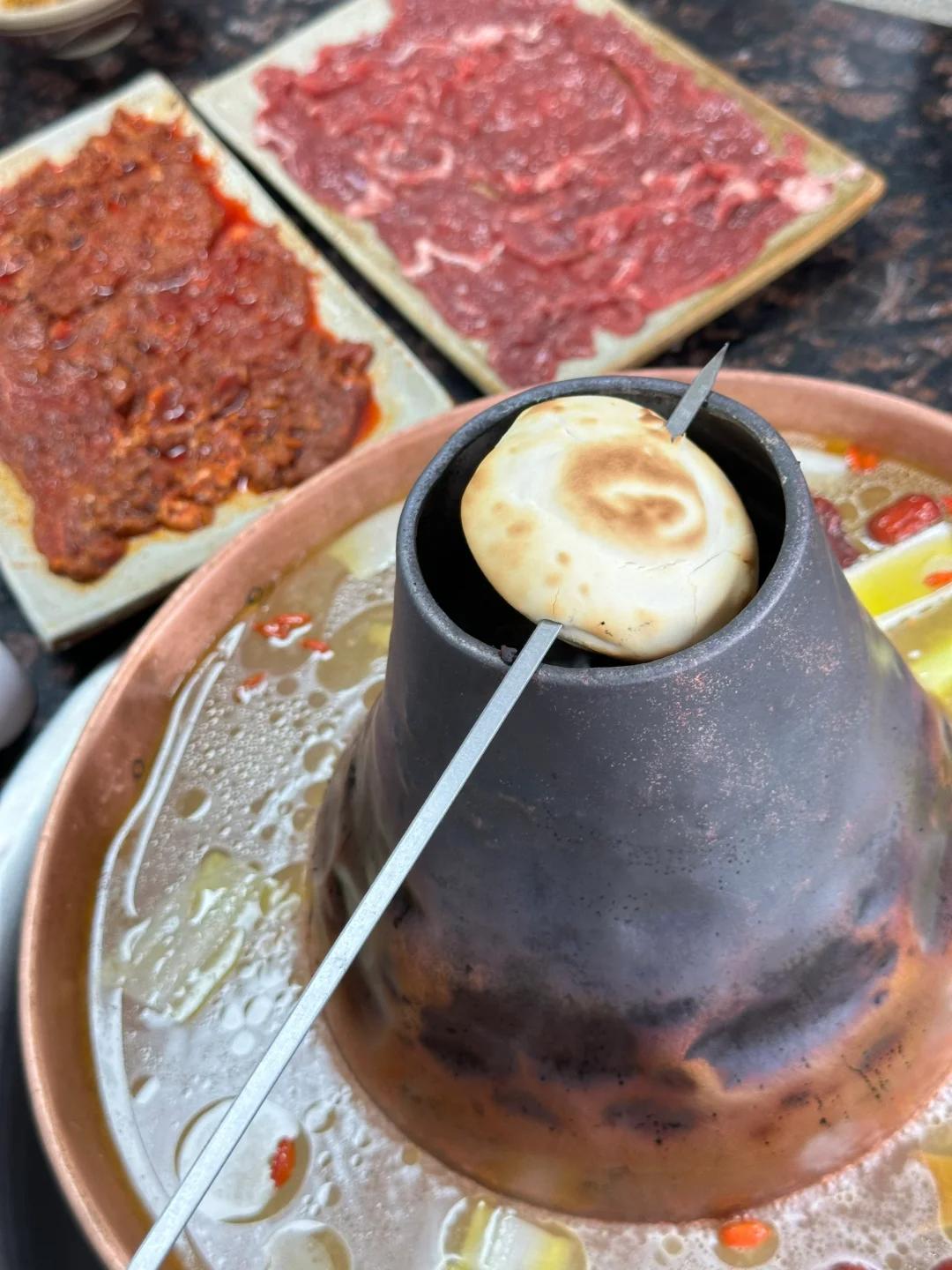 直接点三鲜汤锅+白面小饼+油泼辣子蘸料。铜锅烧开,先不涮肉,而是烤热饼子,小饼架在铜锅上烤至金黄。