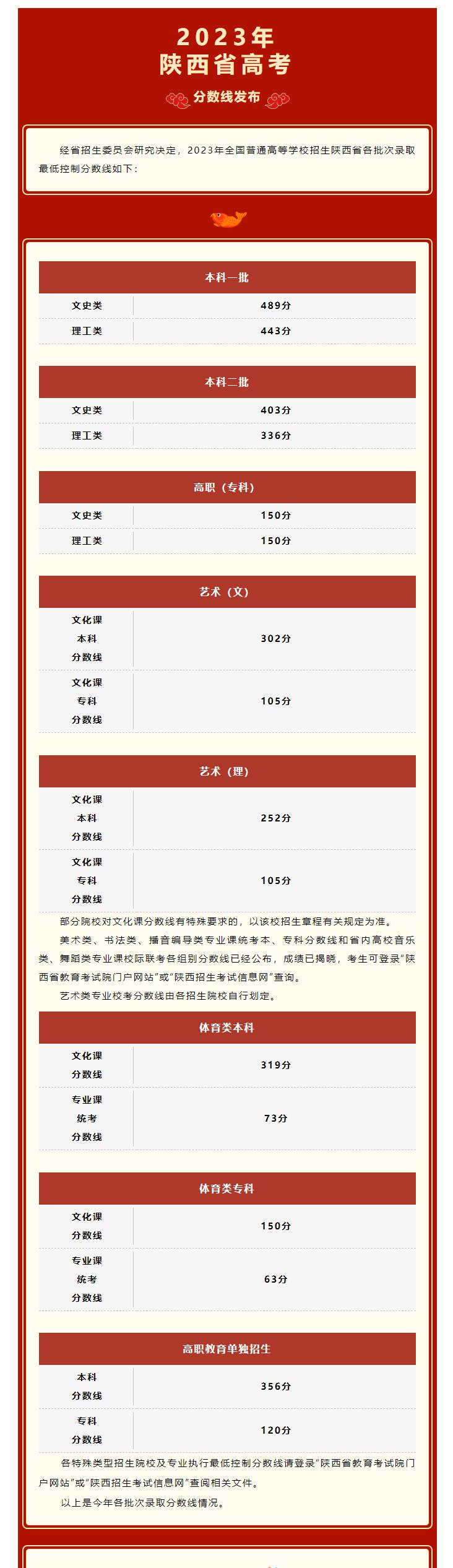 经省招生委员会研究决定,2023年全国普通高等学校招生陕西省各批次录取最低控制分数线如下: