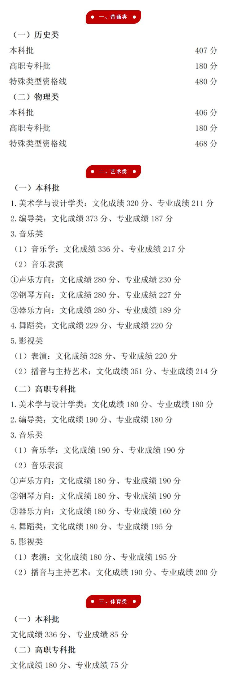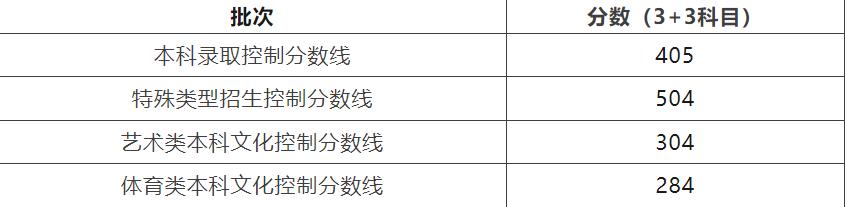 体育类一段线587分;二段线480分。高水平运动员文化录取控制线为普通类一段线。其中在教育部“阳光高考”平台公示可享受65%优惠分值的考生,按普通类一段线的65%、即287分执行。