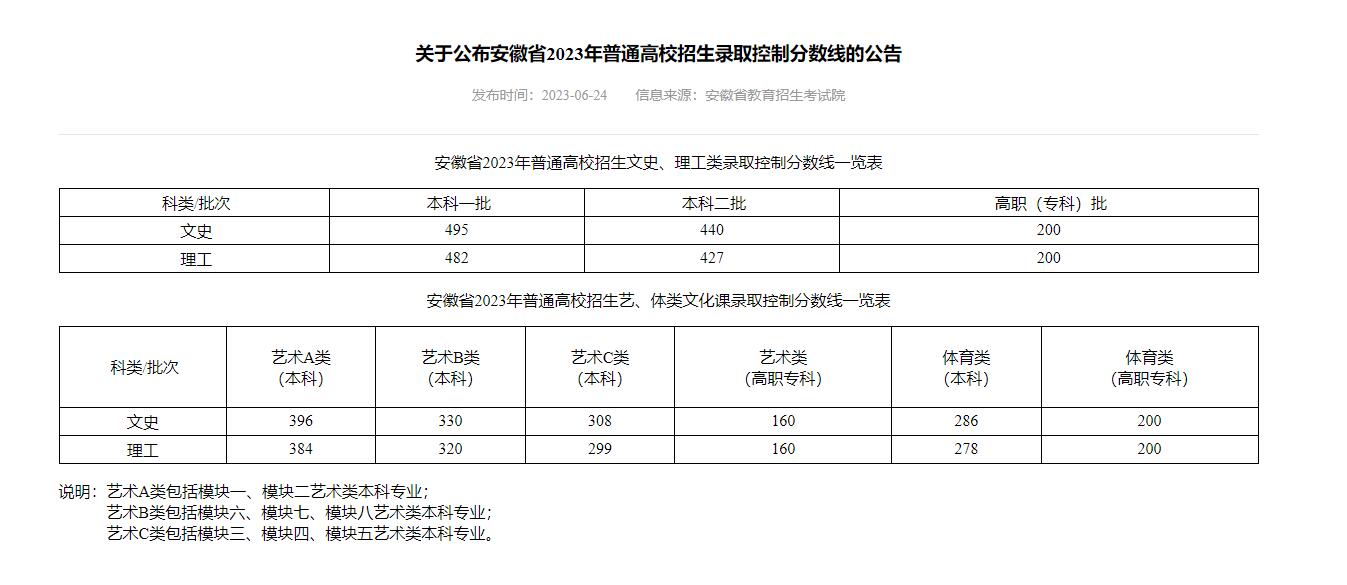 6月24日,经省招委会议审议批准,省教育招生考试院公布安徽省2023年普通高校招生各批次录取控制分数线。