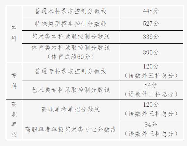 文科本科一批次458分,本科二批次354分;理科本科一批次396分,本科二批次285分。