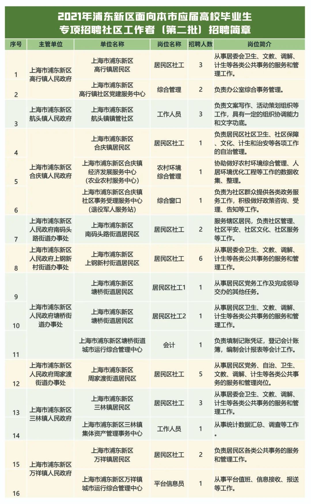 3.招聘单位规定的岗位聘用要求、资格条件和身体条件。具体岗位要求以《2021年浦东新区面向本市应届高校毕业生专项招聘社区工作者(第二批)简章》为准。