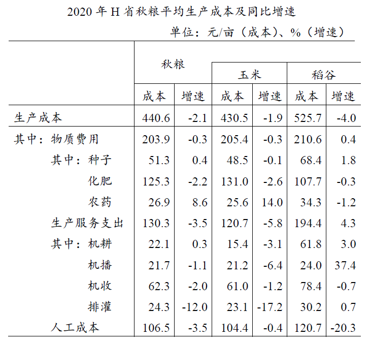 2020年,H省秋粮玉米和稻谷的市场平均交易价格分别为2.34/公斤和2.74/公斤,分别比上年上涨28.6%8.7%。按此价格测算,2020年全省农户种植玉米、稻谷扣除成本前的产值分别为957.1/亩、1520.7/亩,分别比上年增长33.4%8.9%