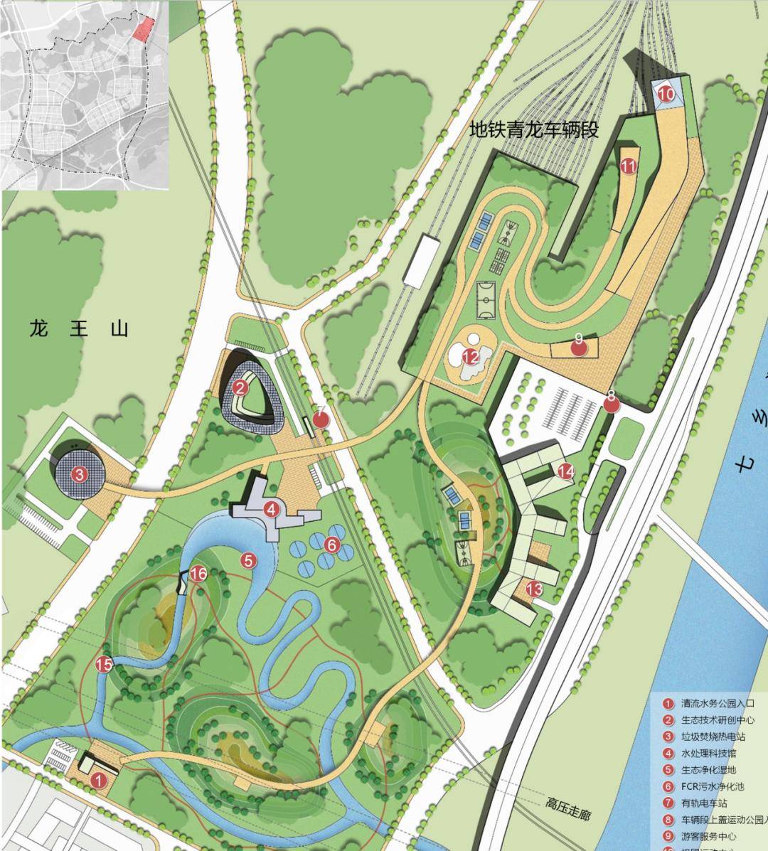 核心区东北角是市政设施密集区域,建有500kV龙王山变电站和地铁青龙车辆段,东西向高压走廊穿过用地南侧,同时又是从北部进入核心区的门户地段,通过清流水务公园将这两大市政设施进行整合,创建以生态技术研创、环保教育和极限体育运动为主题的新型城市活力区,同时为进入核心区的市民树立鲜明的城市意象。
