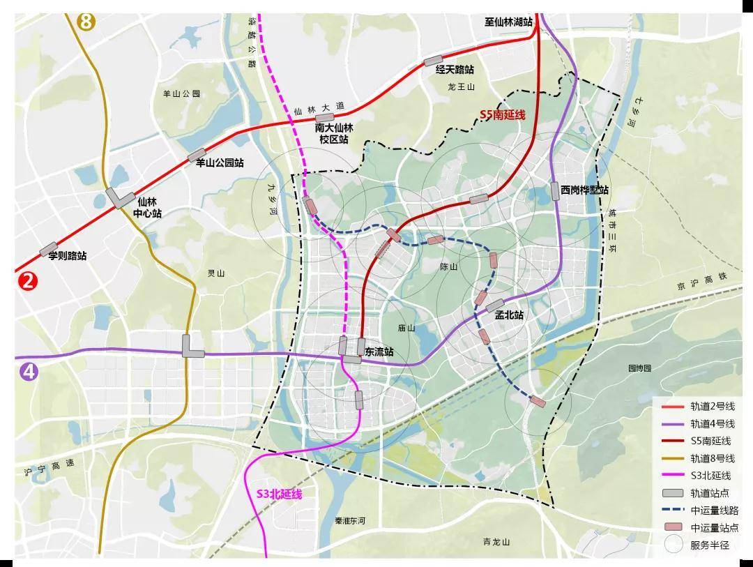 紫东地区核心区规划大中运量4条,分别是市域轨道S5线、S3线、城市轨道4号线、中运量线。按照轨道交通站点500米半径计算,站点覆盖率为42.8%;按照800米半径计算,站点覆盖率为63.9% 。