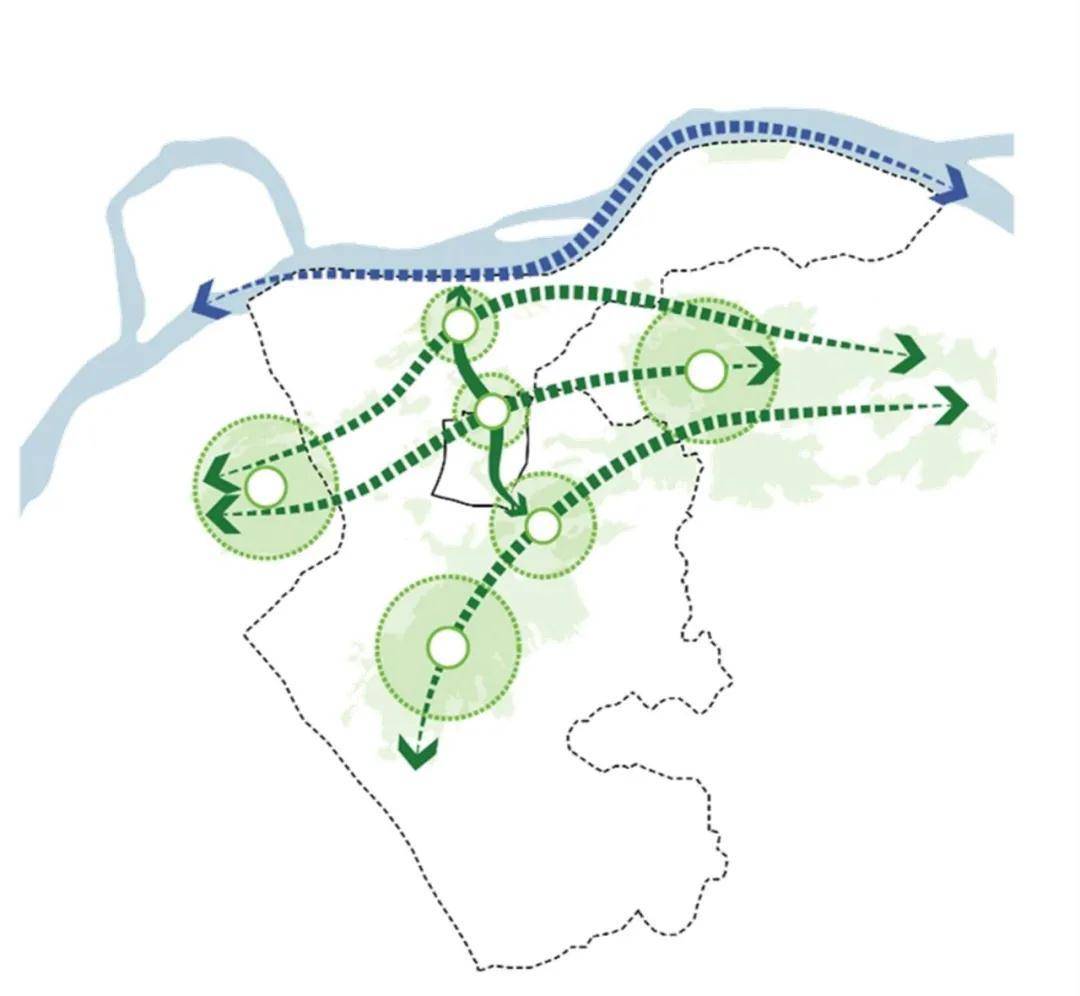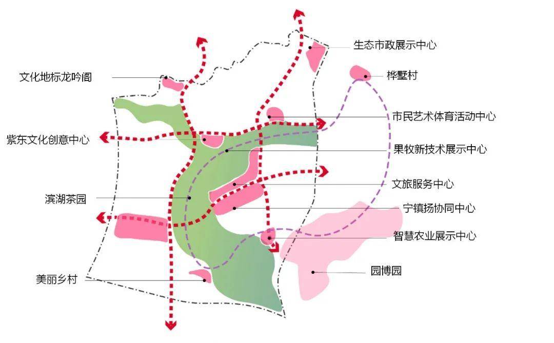 沿着景观大道环路分布的孟北综合中心、东流商务中心、庙山水库与茶园、陈山公园、文化艺术中心、西岗果牧文化园、紫东文化创意中心、文化体育公园等多样化的公共空间与服务设施,将为市民、游客及就业者提供连续而多样的活力场所,促进形成宁镇扬高品质服务的共享基地。
