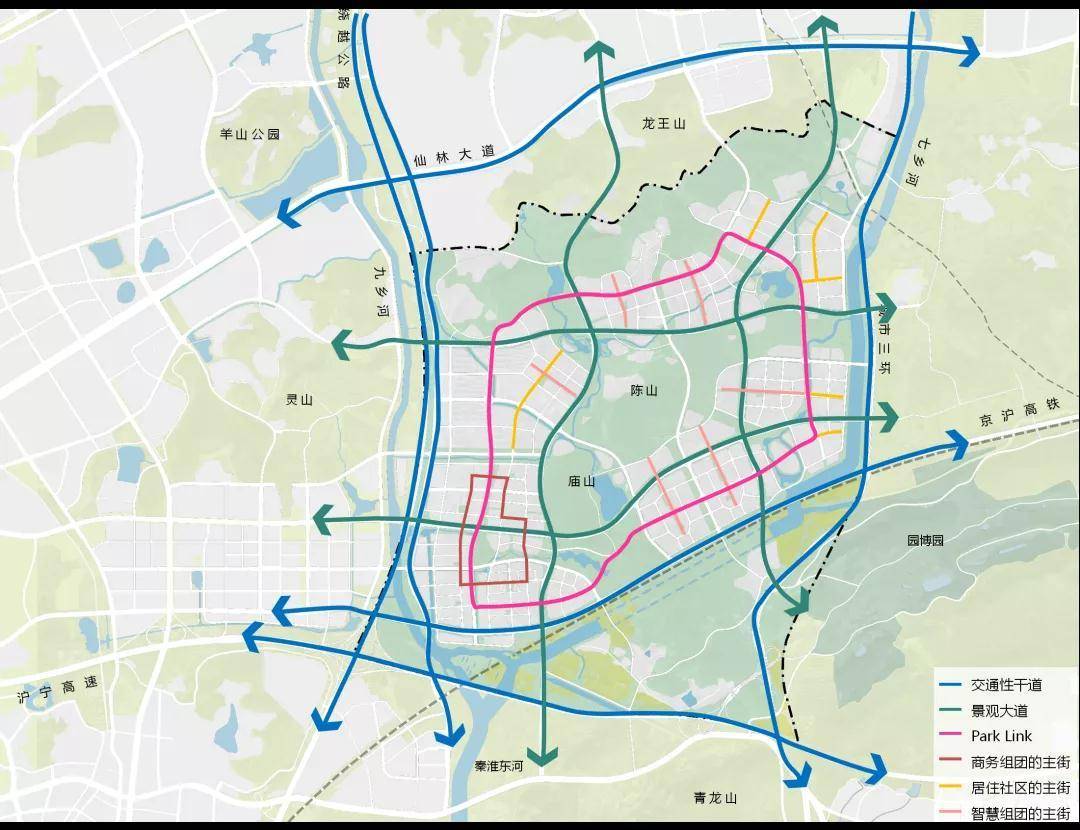 根据道路的功能属性及其空间特色,紫东核心区内特色道路主要分为交通性干道、景观大道、Parklink、主街。