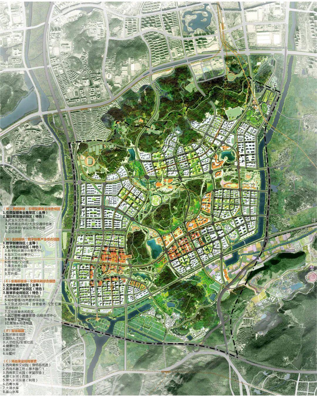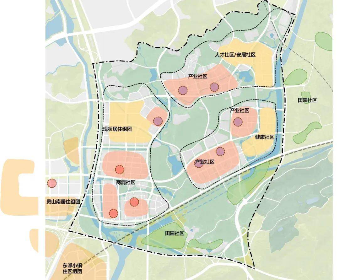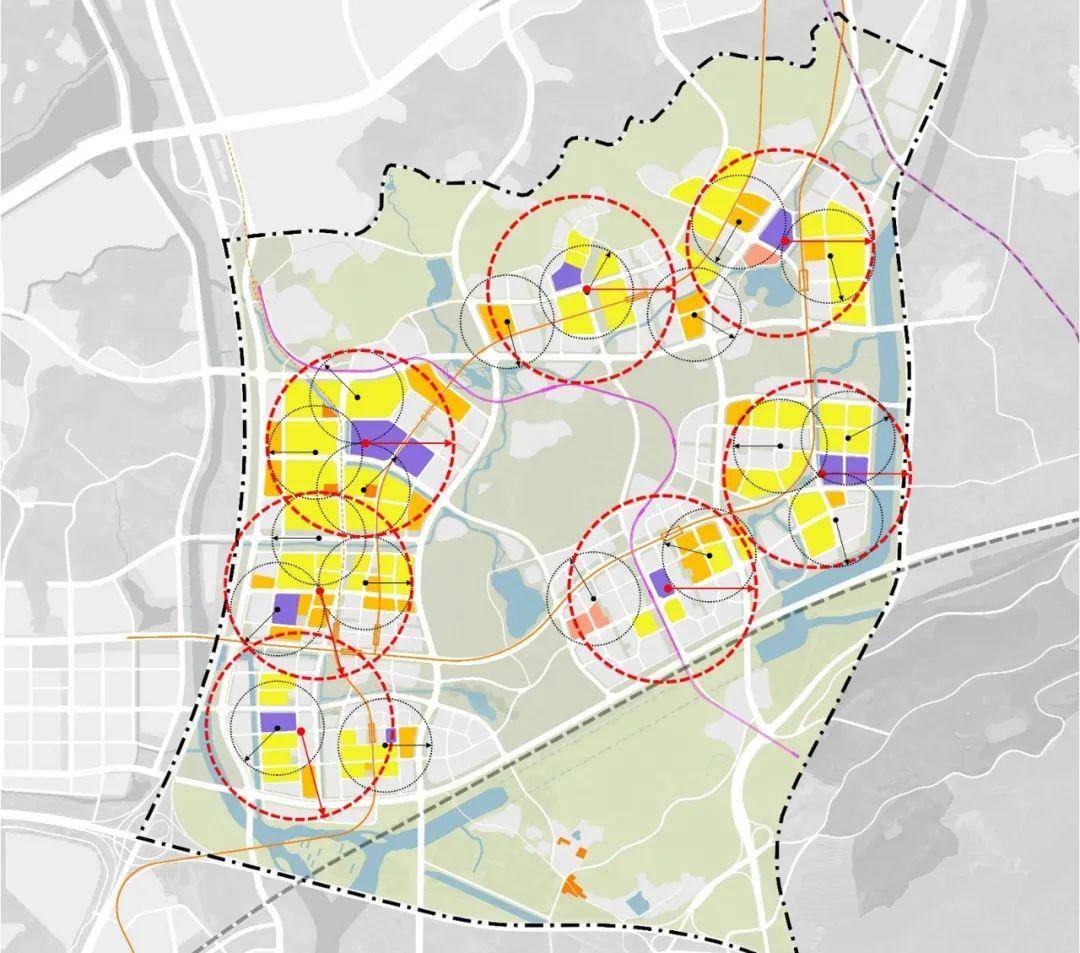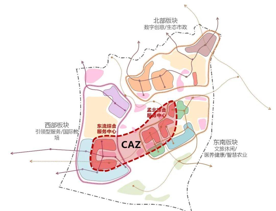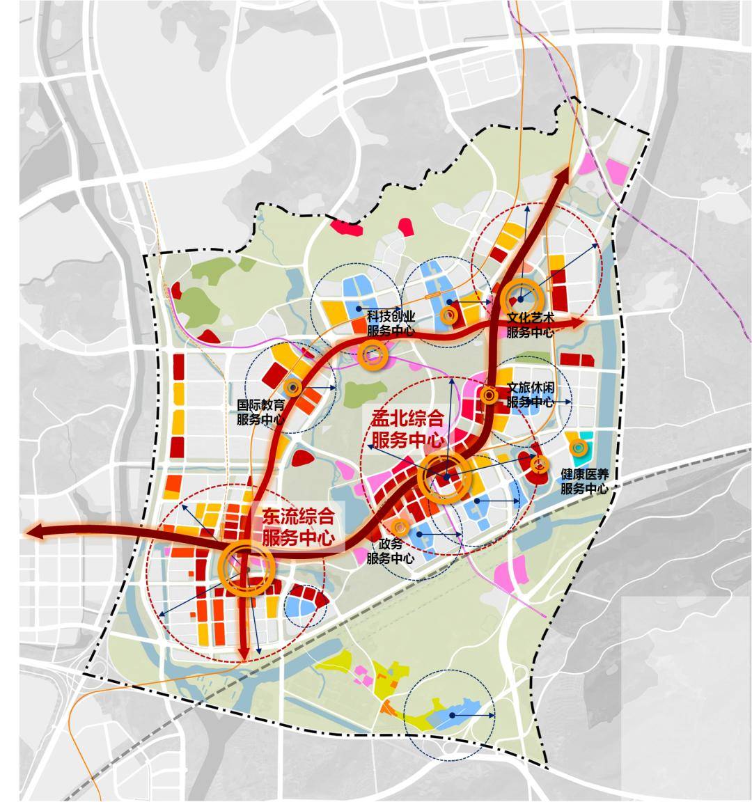 在“中央绿脉”周边,沿城市主干道布局公共服务功能,形成以东流、孟北两处综合服务中心为核心的中央活力带(CAZ)。在各组团内部,结合功能定位和用地条件,打造多种类型的居住和科研社区。